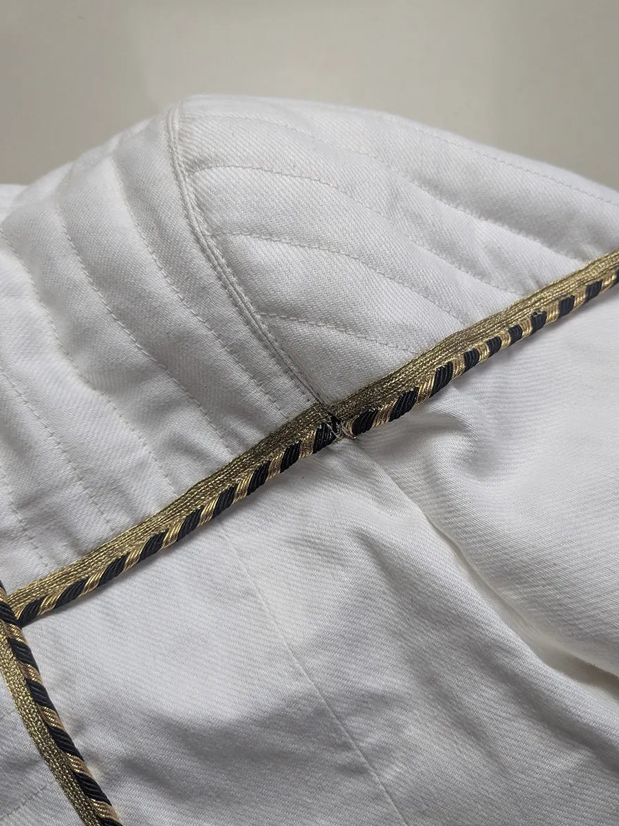 Had them make me a semi-custom version with the piping along the edge of the uniform flap. These are high quality uniforms and I definitely recommend them over others I've gotten. If you want one screen-accurate with the piping, be sure to ask them about it. They're super easy to work with.